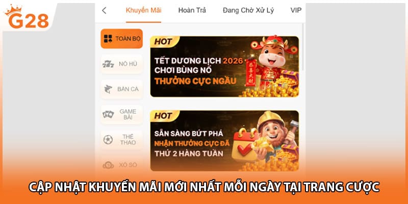 Các chương trình khuyến mãi G28 luôn được thiết kế theo từng mục đích chào mừng người mới, giữ chân thành viên lâu năm hoặc kích thích người chơi quay lại. Mỗi nhóm khuyến mãi đều có lợi thế riêng, nhưng điểm chung là điều kiện đơn giản và được G28 cập nhật liên tục theo từng tuần.